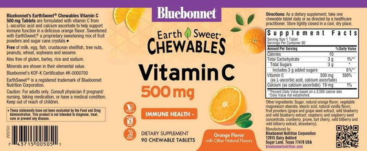 Bluebonnet Nutrition EarthSweet Vitamin C 500 mg Chewable Tablets Orange - Immune Health Support - Antioxidant Protection - Gluten-Free, Vegan - Maximum Absorption - 90 Count Pack