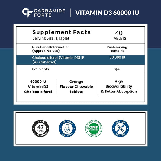Chewable Vitamin D3 60000 IU Tablets for Women & Men - Natural Cholecalciferol Supplement - 40 Count