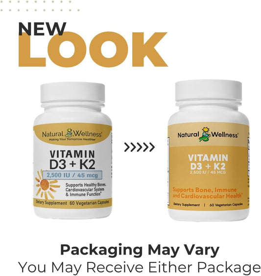 Vegan Natural Wellness Vitamin D3 + K2 Capsules for Bone, Heart, and Immune Health - 2500 IU D3 & 45 mcg K2 - 90 Count
