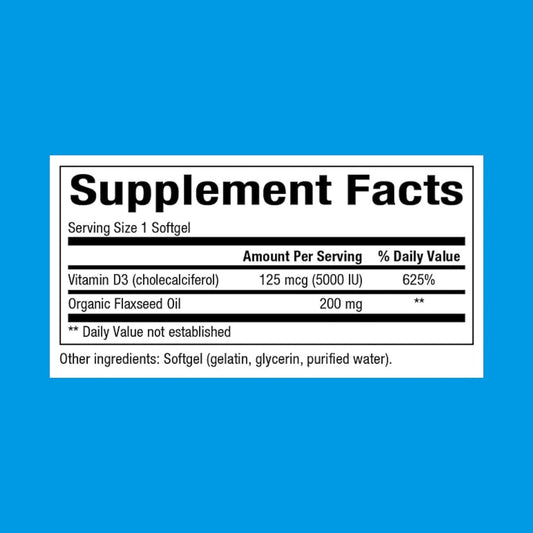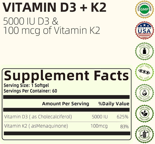Vitamin D3 K2 5000 IU + 100 mcg Softgels for Bone, Teeth, Muscle, Immune Health - 60 Count