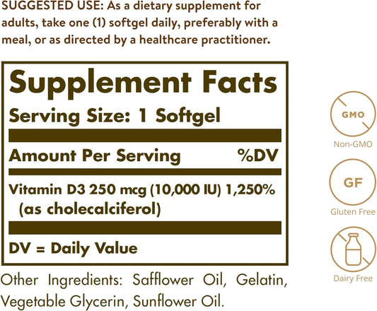 Solgar Vitamin D3 Cholecalciferol 250 MCG 10000 IU Softgels for Healthy Bones, Teeth, and Immune System - Non GMO, Gluten and Dairy Free - 180 Count