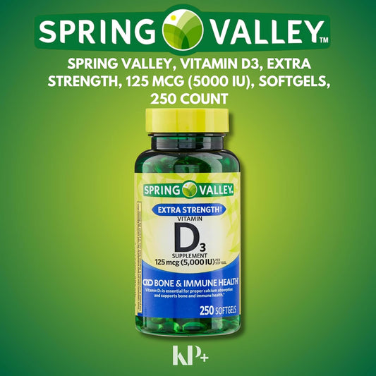 Spring Valley Vitamin D3 Softgels 125MCG 5000 IU, 250 Count with Free KP+ Sticker