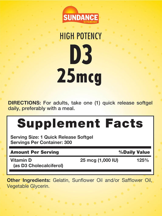 High Potency Sundance Vitamin D3 1000 IU Softgels - 300 Count - Essential Non-GMO & Gluten-Free Supplement