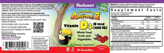 Bluebonnet Nutrition Rainforest Animalz Vitamin D3 400 IU Chewable Tablets - Soy, Dairy, Gluten-Free, Non-GMO, Kosher Certified, Vegetarian-Friendly, Natural Mixed Berry Flavor - 90 Count