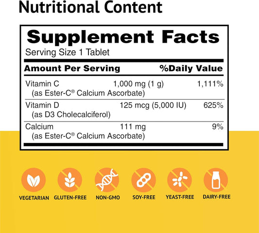 Ester-C 1000mg with D3 Bone Immune Complex Vegetarian Tablets - 24-Hour Support - 60 Count Bottle - Non-Acidic Vitamin C and 5000 IU Vitamin D3