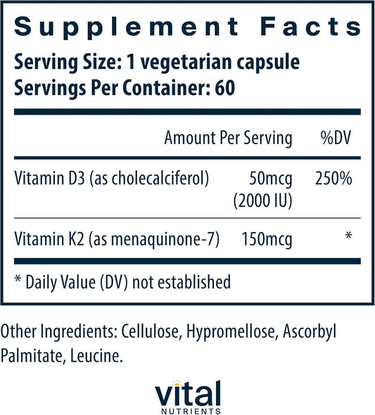 Vitamin D3 K2 Supplement | 2000 IU Vitamin D Complex | Supports Healthy Calcium Levels, Bone & Muscle Health | Gluten, Dairy, Soy Free | 60 Capsules