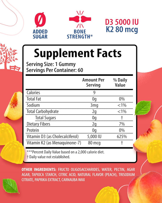 High-Absorption Sugar-Free Vitamin D3 K2 Gummies - Immune & Bone Support Supplement for Adults - 5000 IU - Vegan, Halal, Gluten-Free Chewables