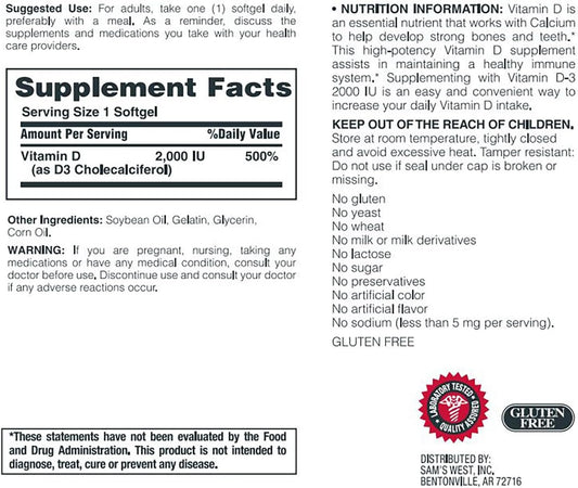 Member's Mark Vitamin D-3 2000 IU Dietary Supplement - 400 Count Bottle