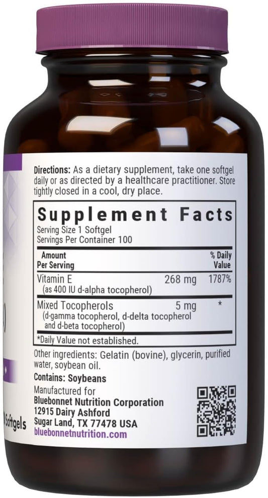 Bluebonnet Nutrition Vitamin E 400 IU Mixed Tocopherols Softgels - Free Radical Protection & Cardio Support - Gluten & Dairy Free - 100 Count