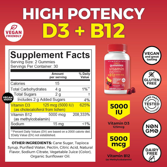 Chewable Vitamin B12 Gummies for Adults with Vitamin D3 - 5000mcg B12 & 5000 IU D3 Gummy Supplement for Women