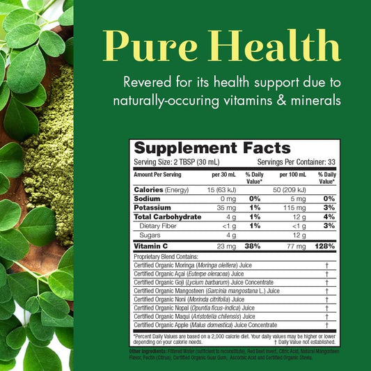 Certified Organic Moringa Juice with Acai, Goji, Mangosteen - Vegetarian and Gluten-Free - 33.8oz