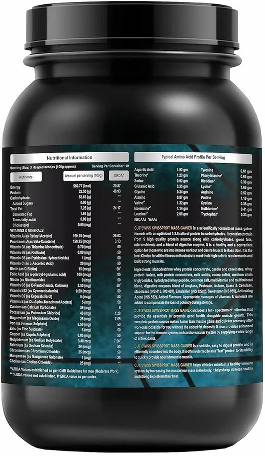 Vanilla Kulfi Flavored Mass Gainer Powder - 52g Protein, 250g Carbs, 1kg - Post-Workout Weight Gain Supplement with Creatine and L-Carnitine - 3 Servings
