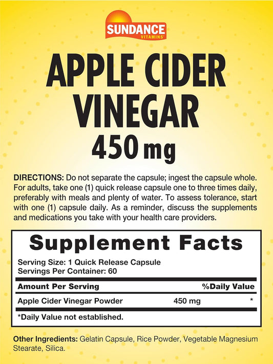 60 Count Sundance Apple Cider Vinegar Capsules - Non-GMO & Gluten Free Supplement