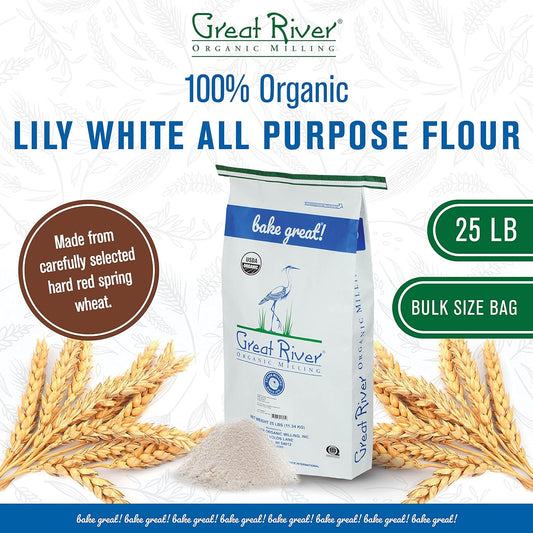 Organic All-Purpose Flour by Great River Milling | Lily White, Unbromated & Unbleached | Non-GMO & Kosher | Ideal for Bread Maker & Ovens | 25 Lb Pack | High Protein & Gluten Balance