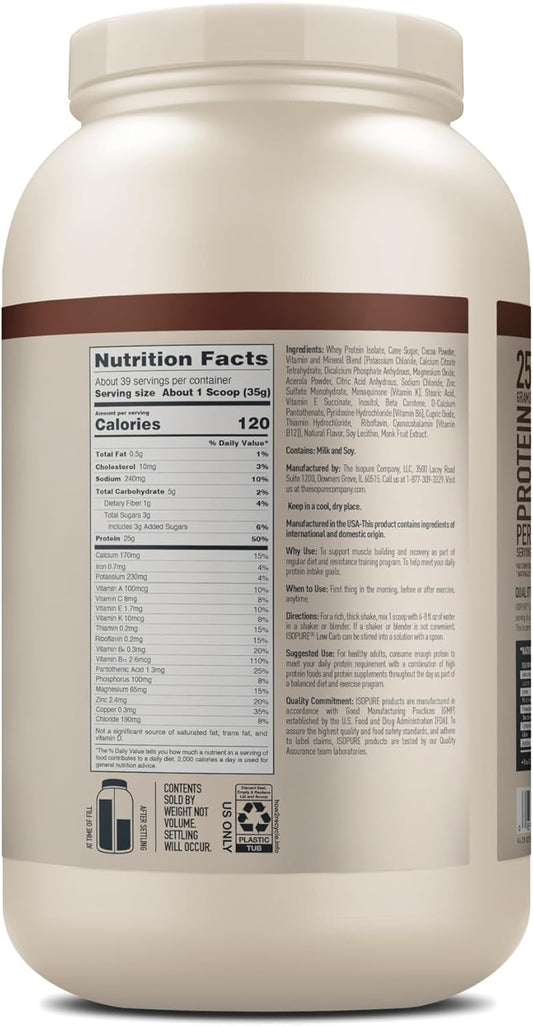 Isopure Low Carb Chocolate Whey Isolate Protein Powder - Gluten & Lactose Free - 25g Protein Per Serving - 3 Lbs, 39 Servings