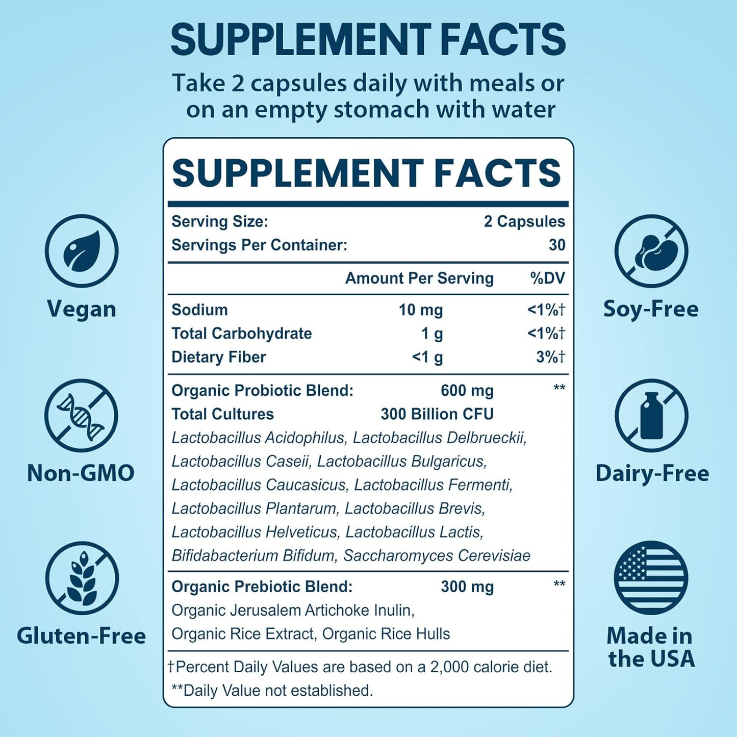 300 Billion CFU Probiotic Supplement for Gut & Immune Health, 12 Strains, Organic Prebiotics, Women & Men, Shelf Stable - 240 Capsules