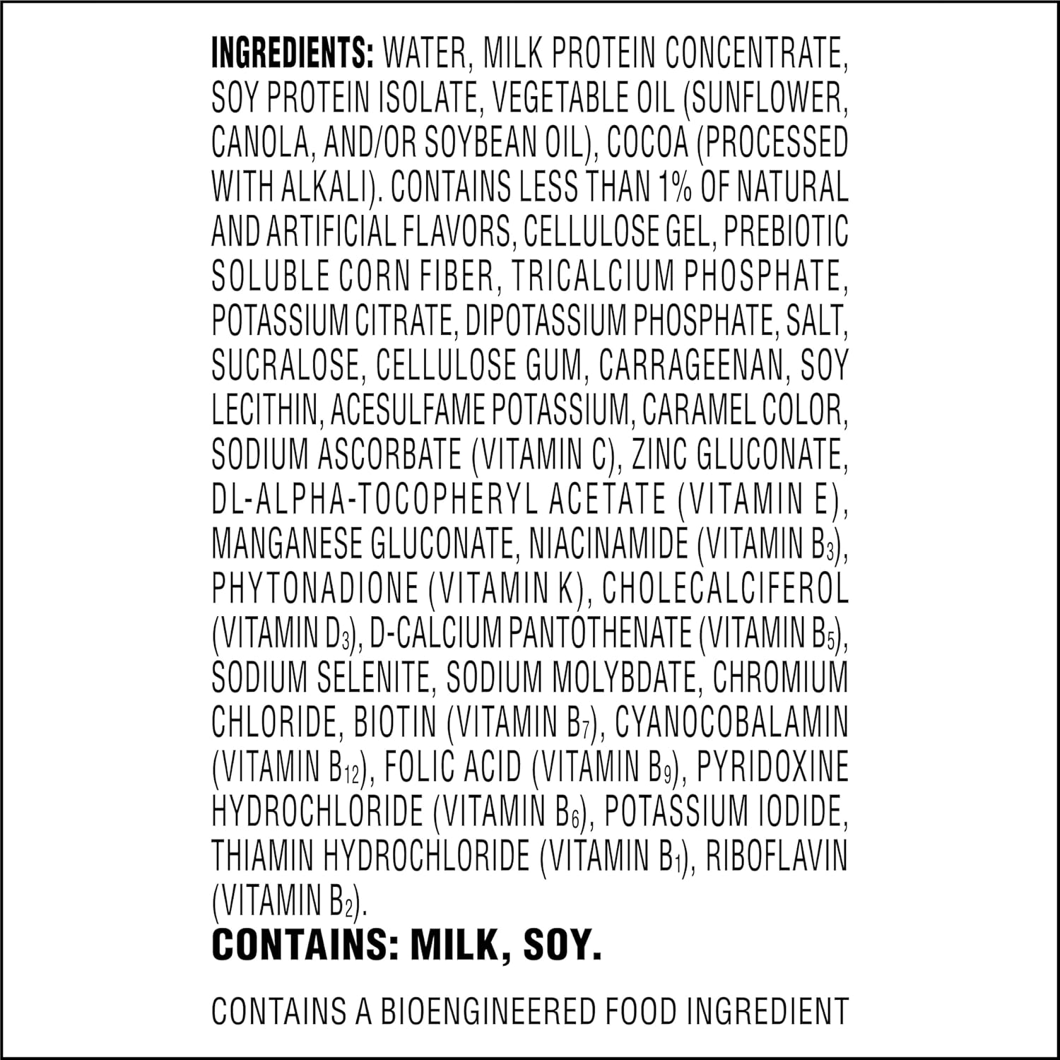 "WATER, MILK PROTEIN CONCENTRATE, SOY PROTEIN ISOLATE, SUNFLOWER OIL, CREAM, COCOA POWDER(PROCESSED WITH ALKALI), PREBIOTIC SOLUBLE CORN FIBER, CELLULOSEGEL, NATURAL AND ARTIFICIAL FLAVORS, VITAMIN & MINERAL BLEND, DIPOTASSIUM PHOSPHATE, POTASSIUM CITRATE, SALT, CELLULOSE GUM, SOY LECITHIN, CARRAGEENAN, ACESULFAME POTASSIUM, SUCRALOSE. VITAMIN & MINERAL BLEND: TRICALCIUM PHOSPHATE, SODIUM ASCORBATE (VITAMIN C), ZINC GLUCONATE, OL-ALPHA-TOCOPHERYL ACETATE (VITAMINE) POTASSIUMIODIDE. MANGANESE GLUCONATE, NIACINAMIDE (VITAMIN B3), PHYTONADIONE (VITAMINK), CHOLECALCIFEROL (VITAMIN D3). O-CALCIUM PANTOTHENATE (VITAMIN B5) SODIUM SELENITE, SODIUM MOLYBDATE. BIOTIN (VITAMIN B7), CHROMIUM CHLORIDE, FOLIC ACID (VITAMIN B9), PYRIDOXINE HYOROCHLORIDE (VITAMIN B6), THIAMIN HYDROCHLORIDE (VITAMIN B1). RIBOFLAVIN (VITAMIN B2), CYANOCOBALAMIN (VITAMIN B12). CONTAINS MILK, SOY."