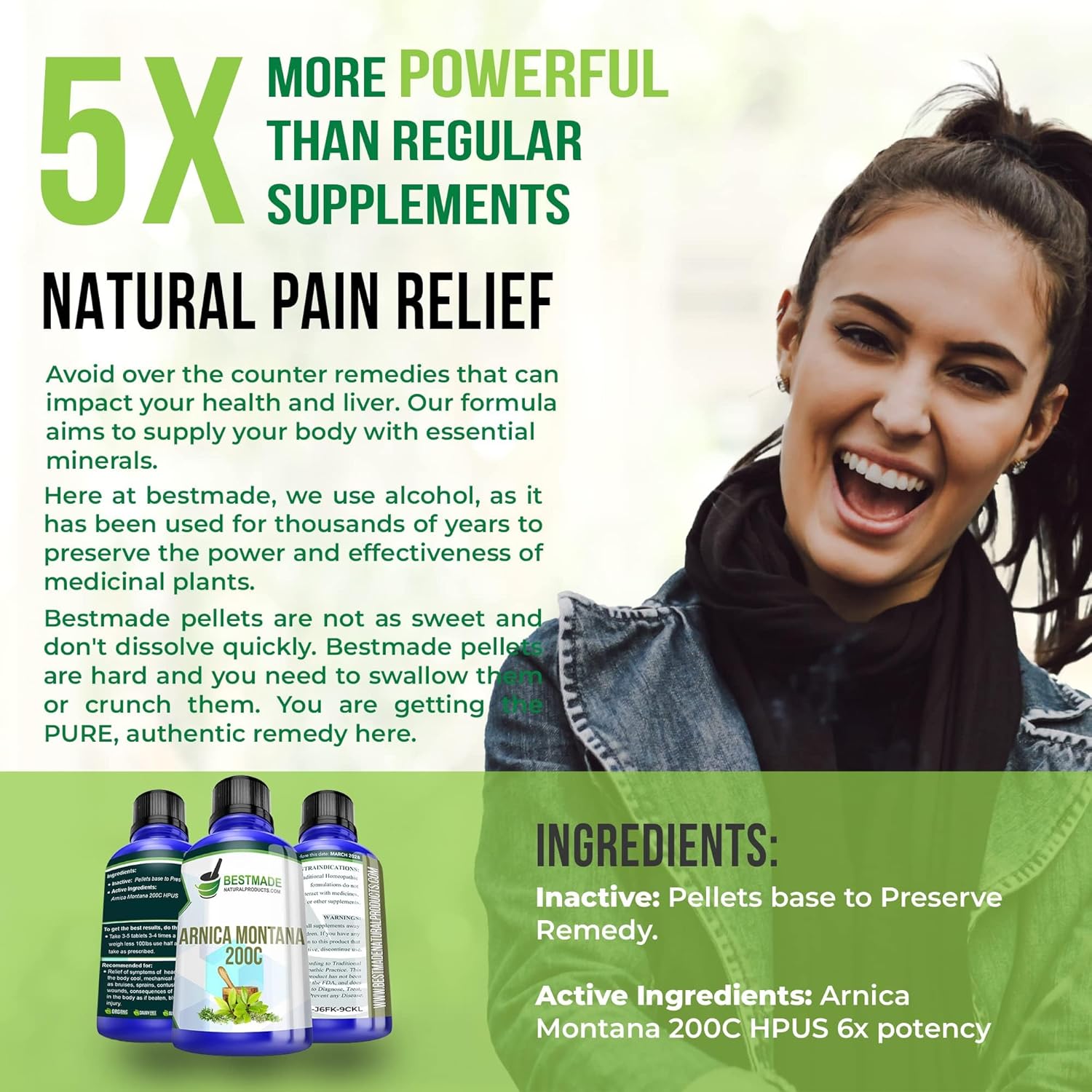 BestMade Natural Products introduces Turbo Arnica 200C, a natural and potent remedy designed to provide relief from muscle soreness, swelling, and injuries caused by overexertion, sports, gardening, or daily activities. Our Turbo Arnica offers unparalleled natural support, leveraging the healing powers of Arnica Montana, known for its effective anti-inflammatory properties and ability to ease discomfort and promote recovery. Unlike other products that rely on quick-dissolving additives and sweeteners, our Turbo Arnica pellets are crafted with lactose sugar and mineral salt only, ensuring purity and a slow-release formula that your body can absorb effectively. This mindful formulation ensures the pellets are not overly sweet and dissolve at a pace that allows your body to fully benefit from Arnica's powerful healing properties. This remedy is free of side effects and offers safe support for the entire family. It can also be used alongside other treatments without concern. To get the best results, do this: Take with water 3-4 times a day. Ages 12 or older, 5 Pellets, Ages below 12, 3 Pellets, Ages below 2, consult your Doctor. PRODUCT INFORMATION 25gm approximately a 1 month supply when used as recommended. ACTIVE INGREDIENTS Arnica Mont 200c