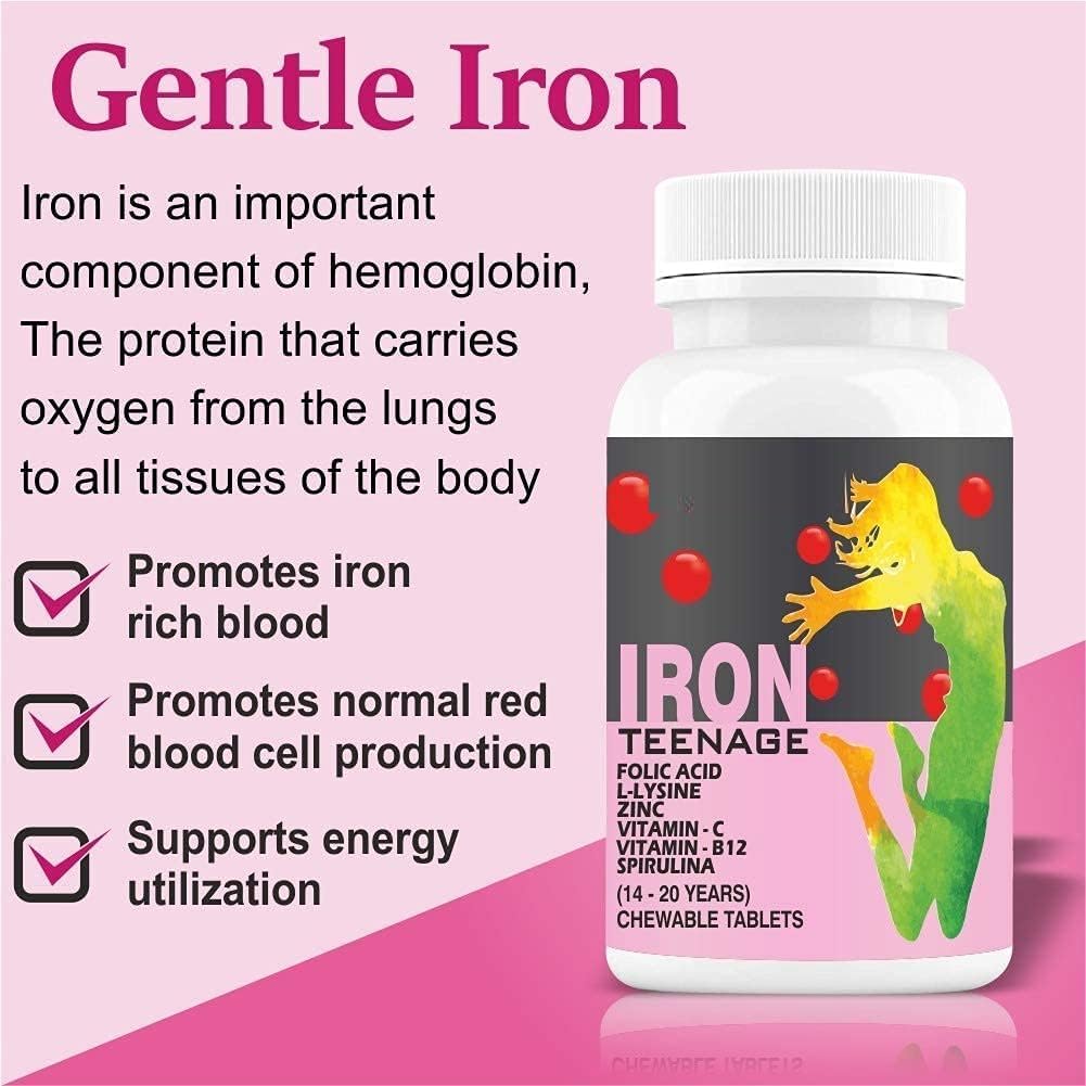 Chewable Iron Tablet with Folic Acid, Vitamin C, B12, Spirulina & Zinc - Boosts Haemoglobin, Immunity, Stamina, Energy for Women & Teenage Girls - 60 Tablets
