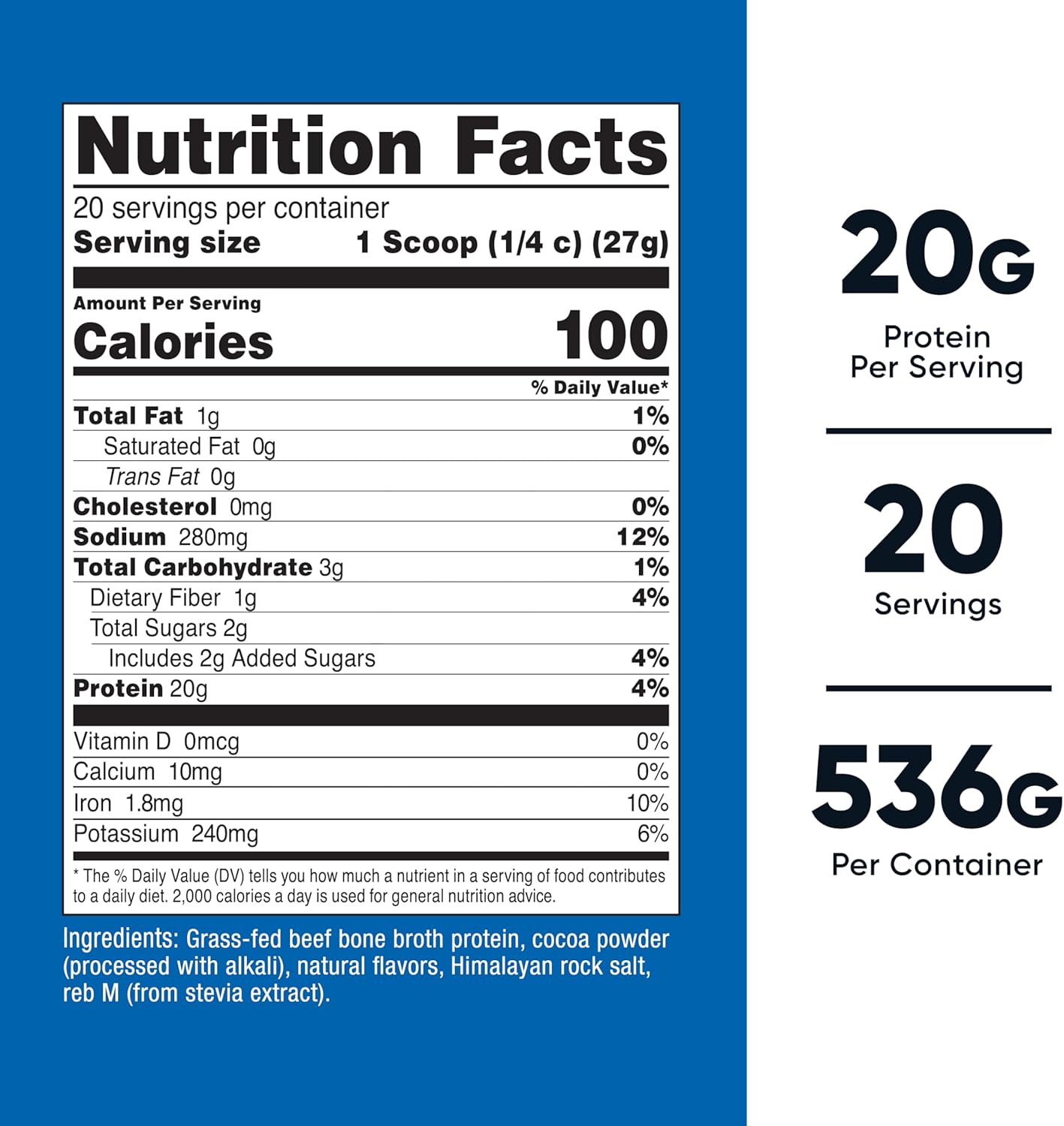 Grass-Fed Beef Bone Broth Protein, Cocoa Powder (processed with alkali), natural flavors, himalayan rock salt, reb m (from stevia extract)