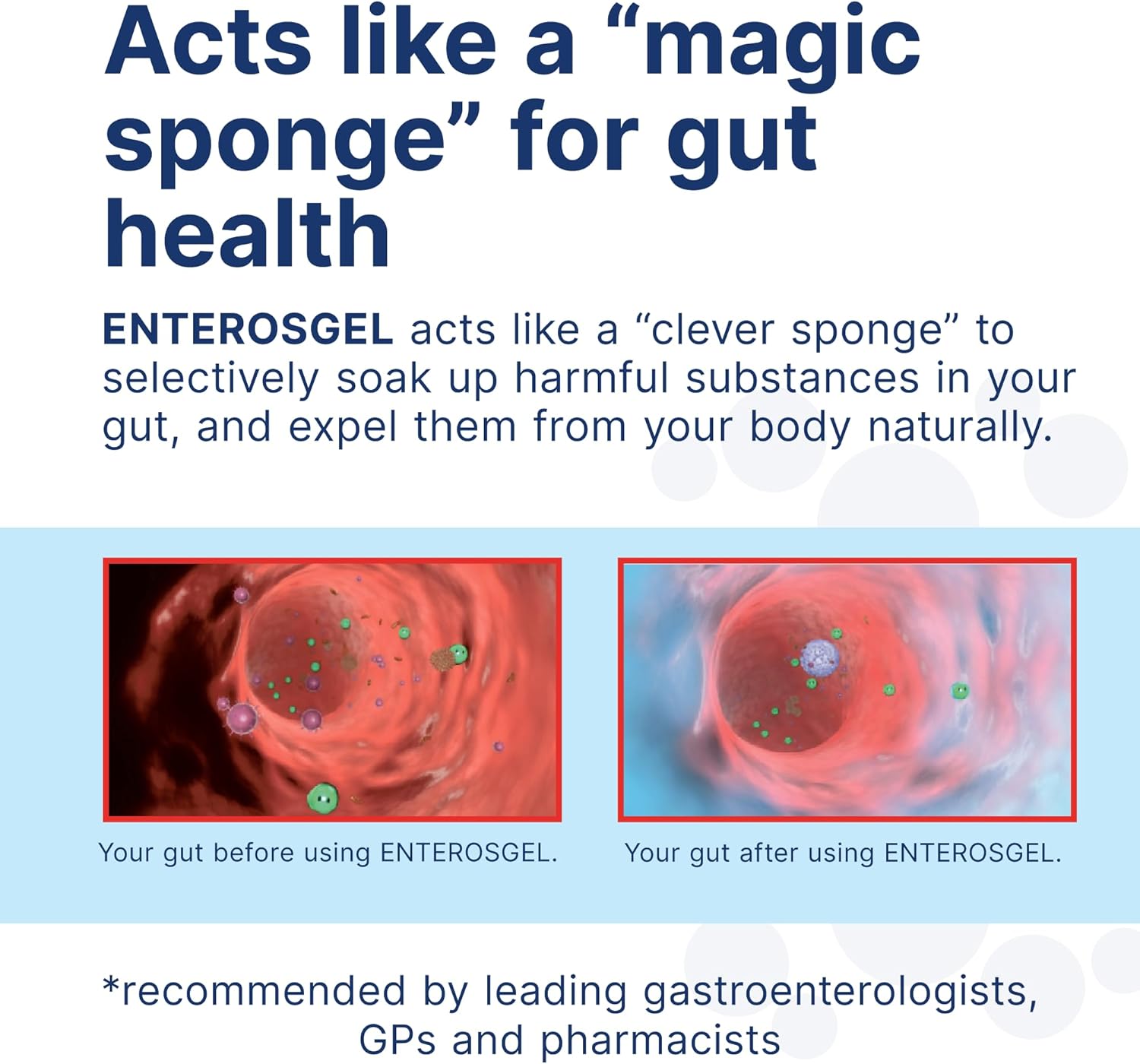 Enterosgel This oral intestinal adsorbent gel is designed to physically capture harmful substances on its surface whilst it moves along the gastrointestinal tract. It is based on organic mineral polymethylsiloxane polyhydrate (70%), that has a porous structure, and a gel-like consistency. In-vitro studies have shown high capacity to adsorb toxins from pathogenic bacteria such as: E.coli, Shigella, Staphylococcal aureus and Clostridium difficile. It also contains 30% Purified water . It is completely excreted within 12-24 hours, is a drug-free treatment, it is not absorbed, not metabolized and it is excreted unchanged. It does not contain substances that can cause allergic or toxic reactions and is free from preservatives, sugar, gluten, taste and colour.