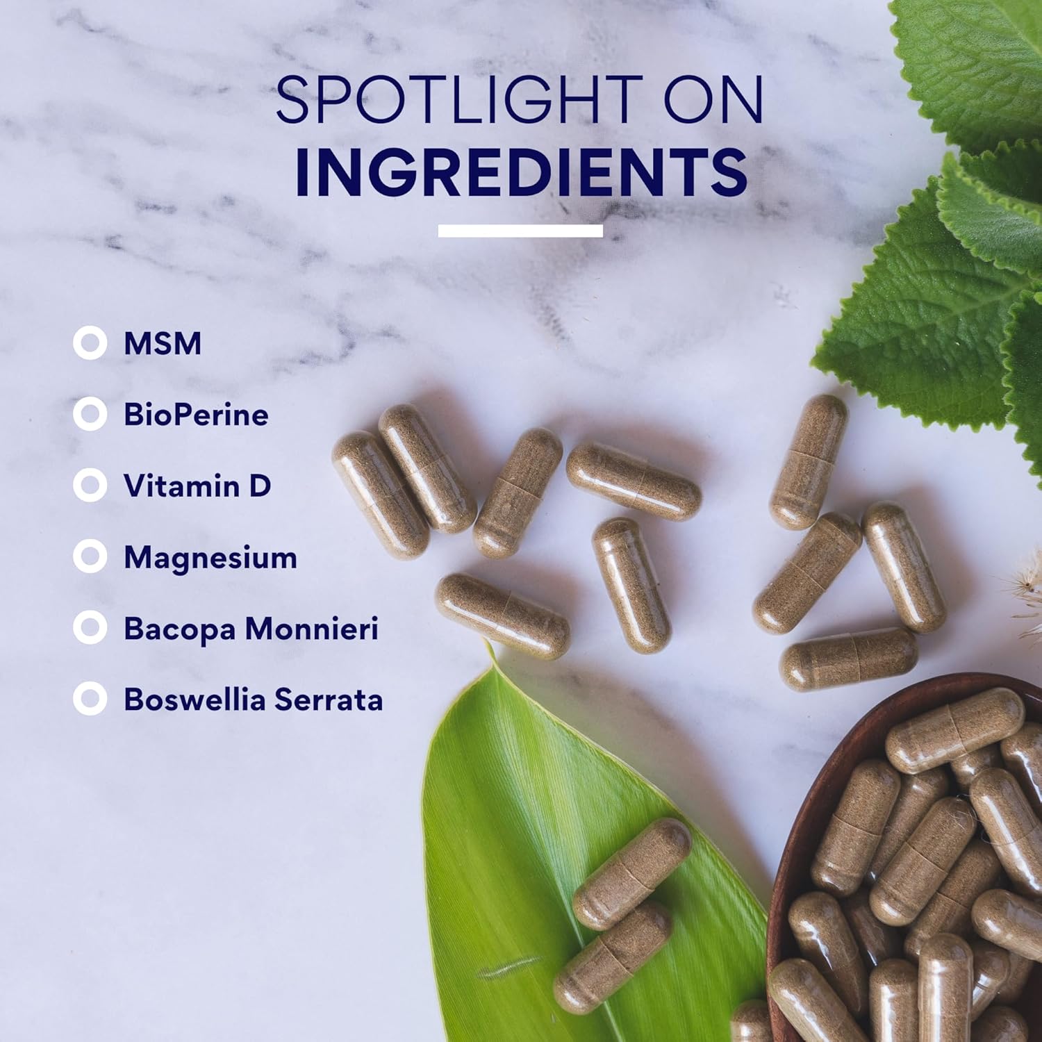 Vitamin D3 (as Cholecalciferol), Mag-X Magnesium Complex (Magnesium Oxide and Magnesium Glycinate), MSM-X Bioavailable MSM Complex: Methylsulfonylmethane (MSM), BioPerine® (piper nigrum) (Fruit) (Standardized to 95% Piperine) (Standardized to 50:1), Boswellia Serrata (Boswellia carterii Birdw.) Extract (Gum Resin) (Standardized to 65% Boswellic Acid), Bacopa (Bacopa monnieri) Extract (Whole Plant) (Standardized to 20% Bacosides), Vegetable Cellulose, Magnesium Stearate, Silicon Dioxide.