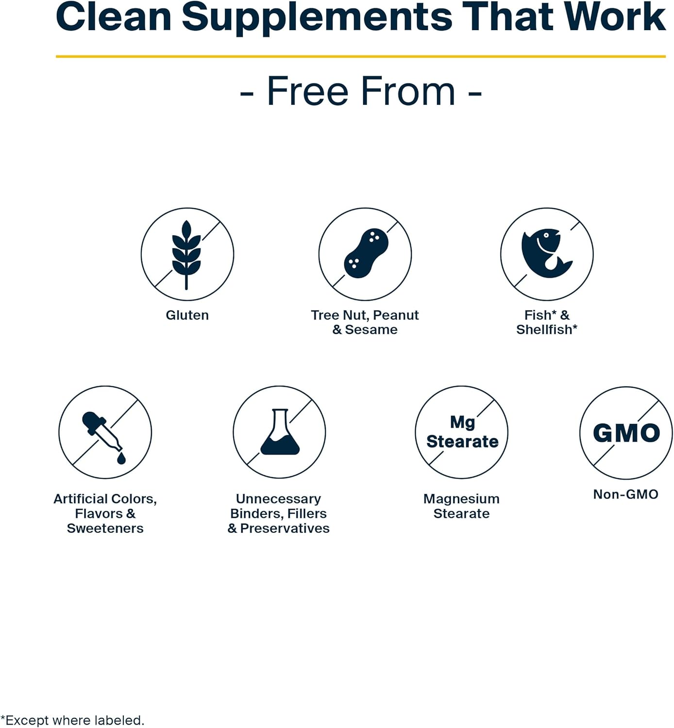 - Clean Formula: Free from gluten, dairy, peanut, tree nut, fish, shellfish, sesame, and egg Made without artificial fillers, coatings, binders, or colors