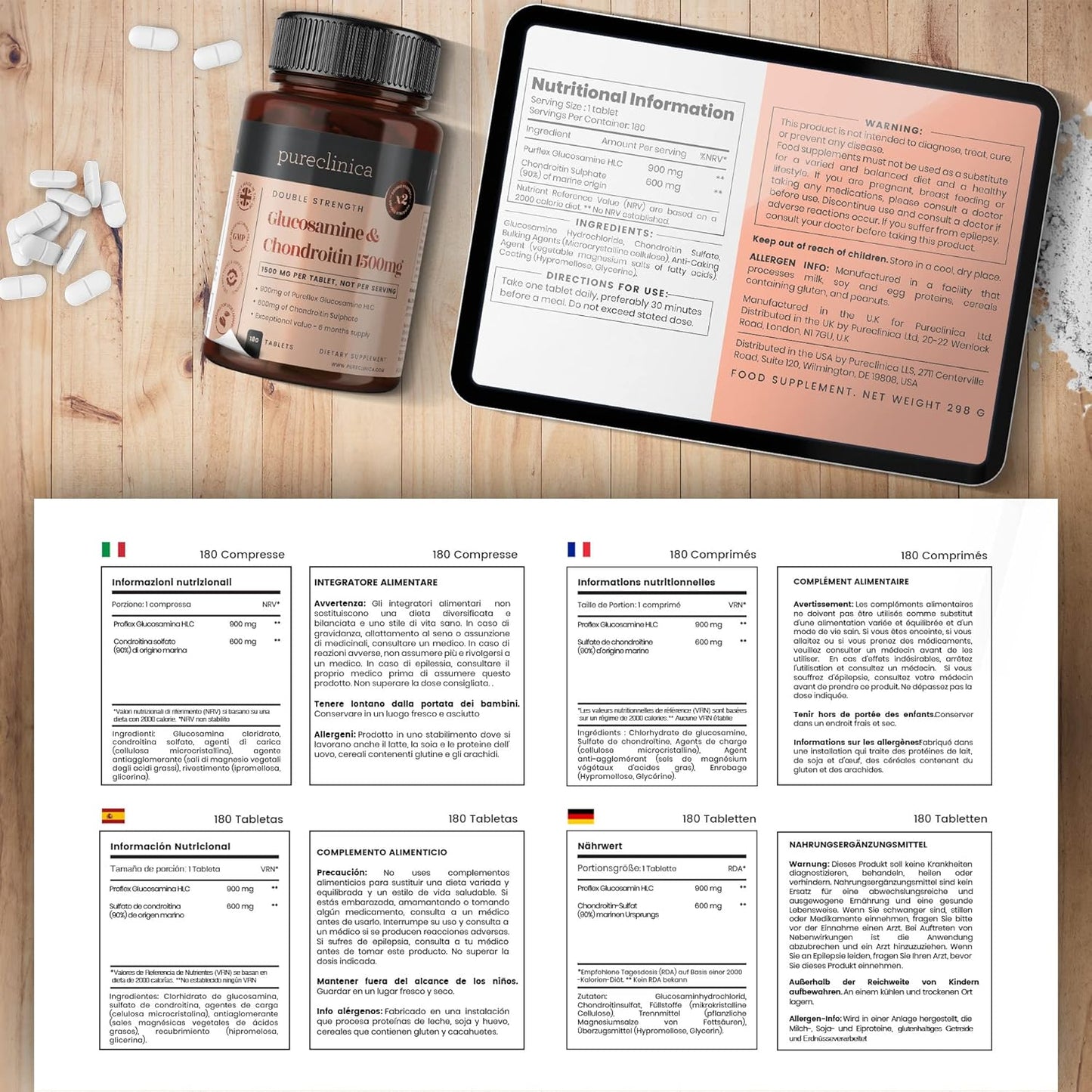 Serving Size: 1 tablet Servings Per Container: 180 Proflex Glucosamine HCL: 900mg Chondroitin Sulphate (90%) of marine origin (fish): 600mg Other ingredients: Malt dextrin, vegetable magnesium stearate (as anti-caking agent).