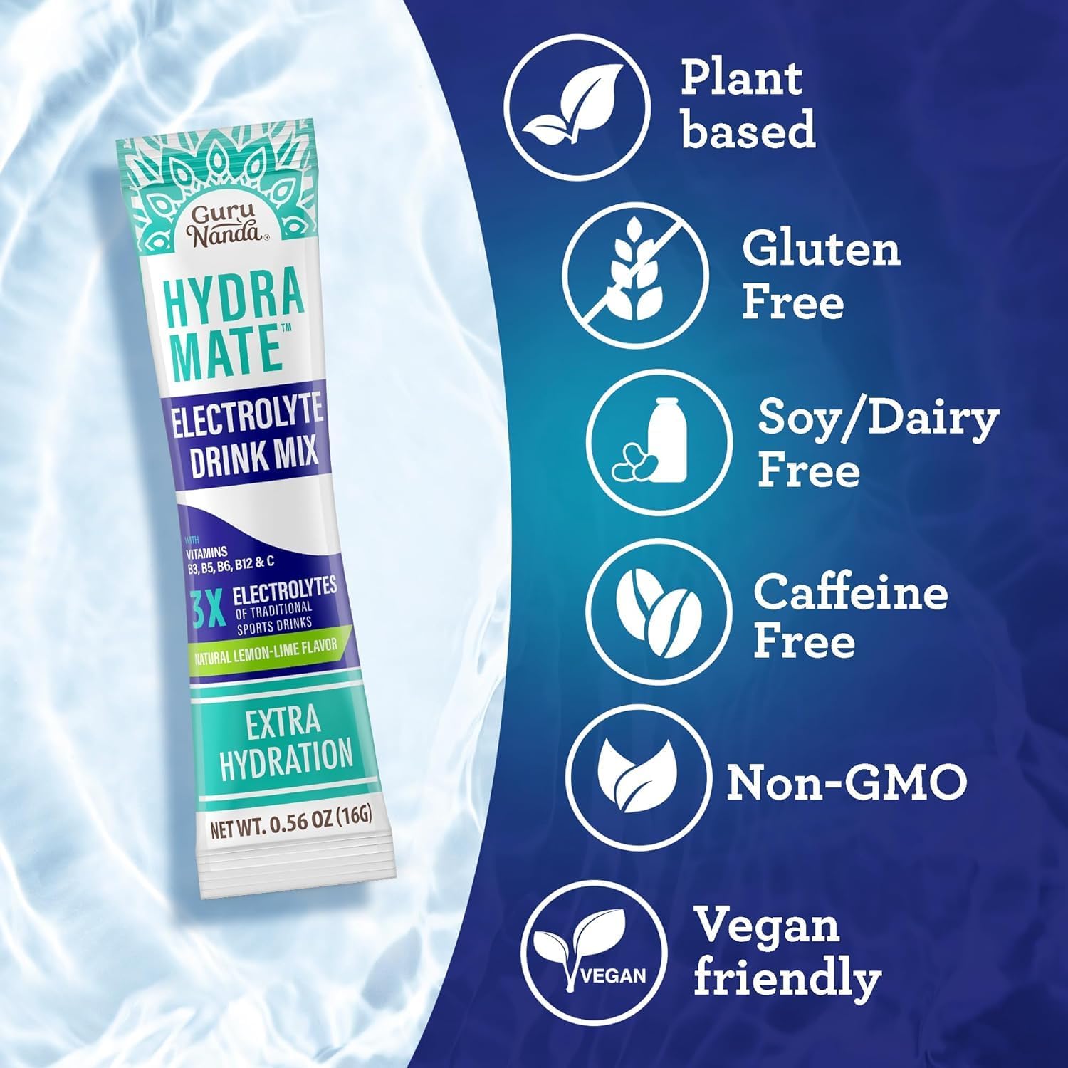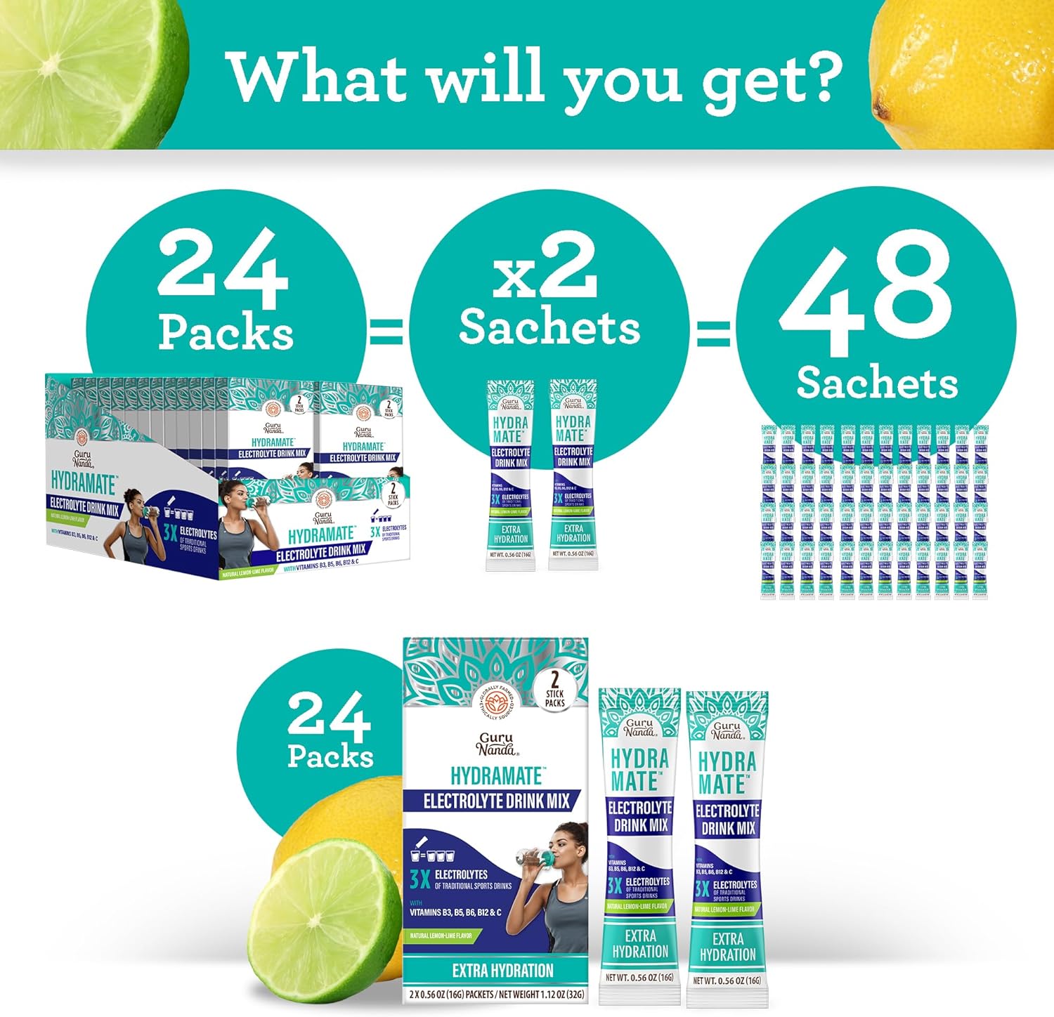 - 48-COUNT CONVINIENCE FOR ULTIMATE HYDRATION: The GuruNanda Hydramate Support contains 24 packs, with each pack comprising 2 sachets, totaling 48 sachets. Mixing just one sachet in a 16 fl. Oz glass offers hydration equivalent to drinking 3 glasses, ensuring quick absorption of electrolytes and water to keep you consistently energized throughout the day.
