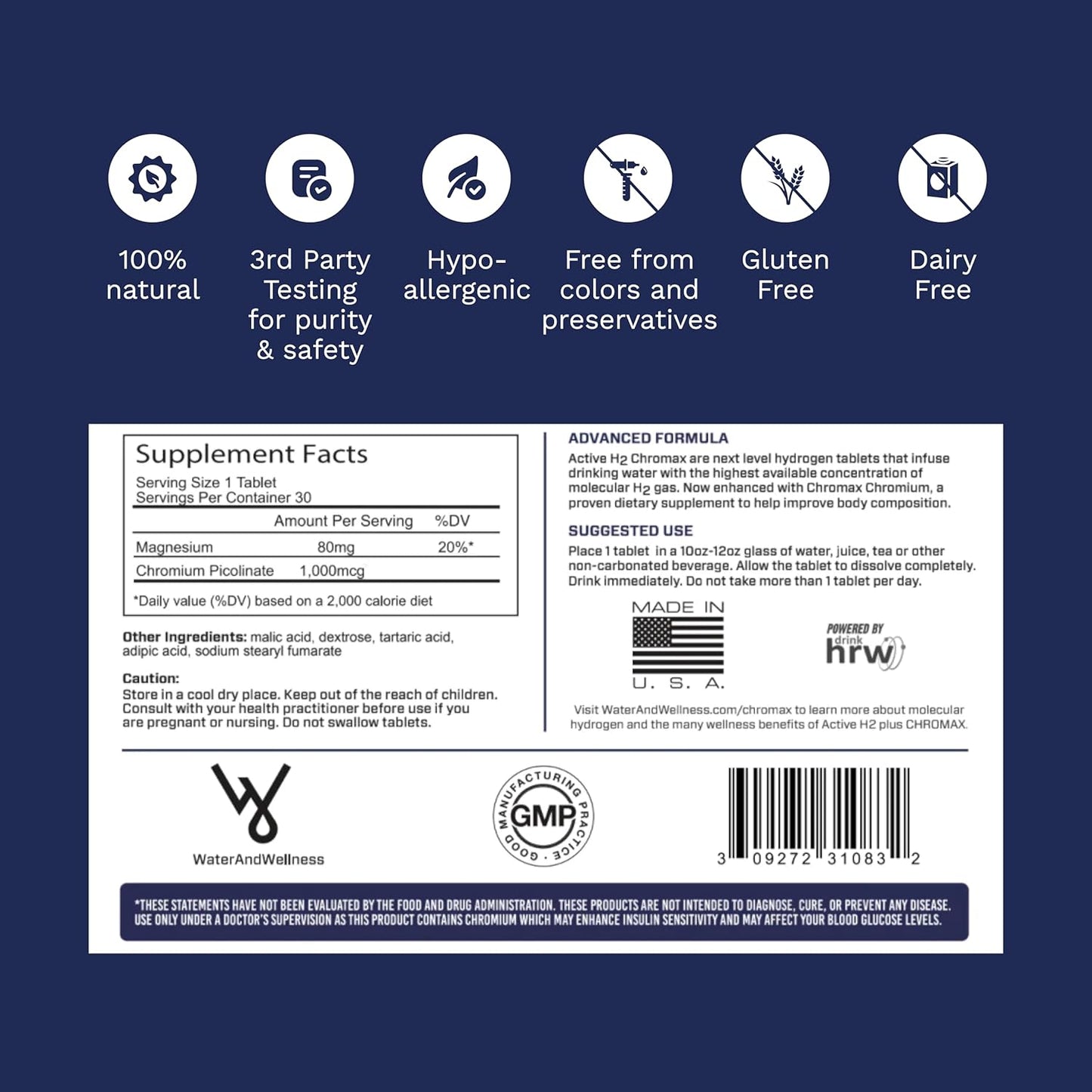 - 💧NATURAL AND EFFECTIVE Active H2 + Chromax is not synthetically or chemically engineered. The blend of minerals works seamlessly together to provide faster results without added stimulants or supplements; Decreases blood sugar levels, bad cholesterol levels, levels of inflammatory markers making you feel more energized throughout your day.