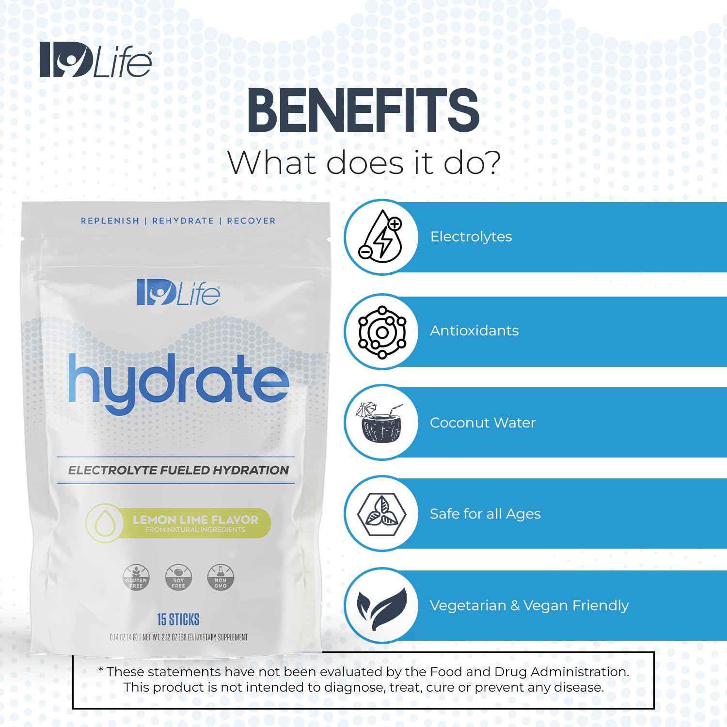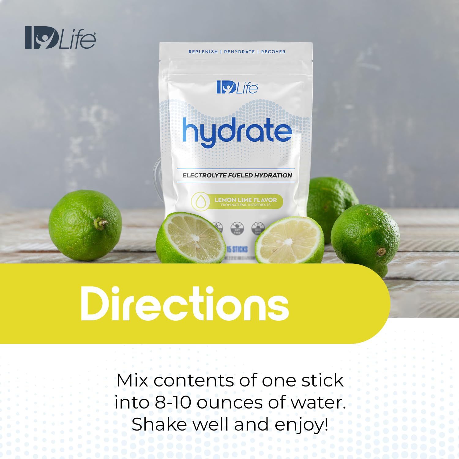 IDLife Lemon Lime Hydrate Drink Powder - Electrolyte-Rich Hydration with Vitamins, MCTs, and Minerals - 15 Sticks