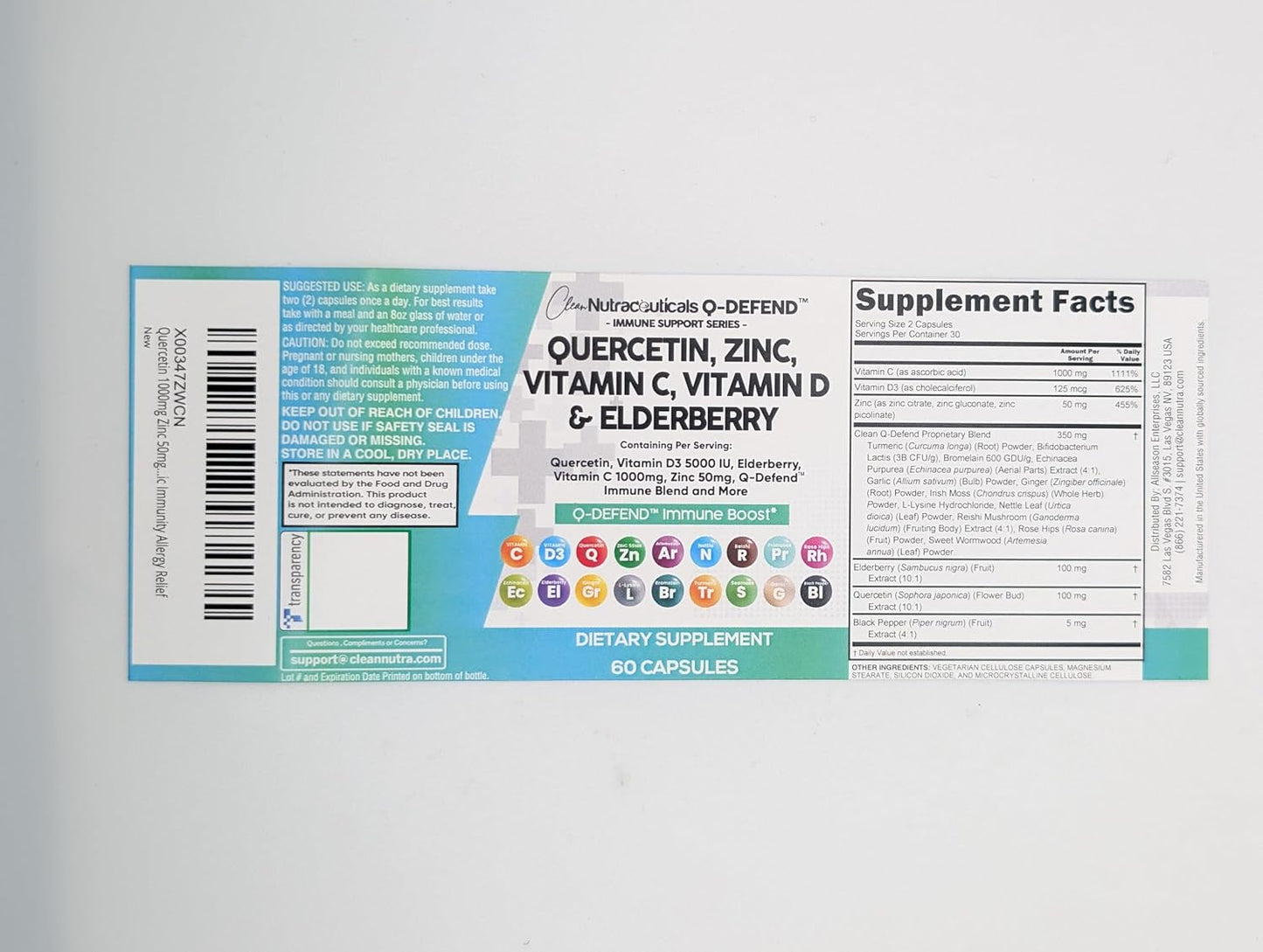 Quercetin (as Sophora japonica) Extract (10:1) 100 mg , Zinc Powerhouse3 Blend (as Zinc Picolinate, Zinc Gluconate, Zinc Citrate), Elderberry (as Sambucus williamsii Hance) (Fruit) Extract (10:1) 100mg, Vitamin C 1000mg, Vitamin D3 5000 IU, Vitamin D3 (as Cholecalciferol), Q-DEFEND Immune Blend: Turmeric (Curcuma longa) (Root) Powder, Ginger (Zingiber officinale) (Root) Powder, Echinacea (Echinacea purpurea) (Aerial Parts) Extract, Garlic (Allium sativum L.) (Bulb) Powder, Nettle (Urtica fissa/Urtica dioica) (Leaf) Powder, Reishi Mushroom (Ganoderma lucidum) (Fruiting Body) Extract, Rose Hips (Rosa canina) Powder, L-Lysine HCI, Bromelain (Bromelia ananas) (Stem) Powder, Bifidobacterium lactis, Irish Sea Moss (Chondrus crispus), Artemisinin (from sweet wormwood) (Leaf), Black Pepper (Piper nigrum) (Fruit) Extract