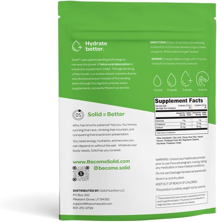 Hydrate better. Solid Electrolytes help you maintain the right balance of fluid, improving performance and staving off muscle cramps without chugging sports drinks or the annoyance of messy powder mixes. How does Solid work? Solid nutrients utilize intra-oral absorption, which means they get from the mouth to the bloodstream in less time than it took you to read this sentence. With Solid, you can absorb as much as 10X the amount of nutrients as with other options, and — because intra-oral absorption bypasses the gastrointestinal tract — your body can start using those nutrients right away. More good news? Now you can skip added sugars, calories, water weight, ineffective absorption, wasted wait time, and the mess of traditional goos, gummies, energy drinks and powder mixes. Instant Hydration Nutrient Density Technology (NDT) sends electrolytes through the lining of your mouth, directly to your bloodstream in as little as 1/10th of the time of powder mixes or sports drinks. 80 tablets per bag (4 tablets per pack, 20 packs per bag) Serving size is 2 tablets, 40 servings per bag. Put 1 or 2 tablet in your mouth and let dissolve(3 to 5 mins) DO NOT CHEW. USE WITHIN 2 YEARS OF MANUFACTURERS DATE