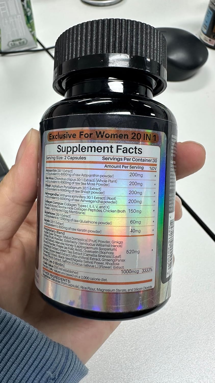 All-in-One Sea Moss, Shilajit, Ashwagandha & Glutathione Supplement for Women, Boosts Energy, 60 Capsules