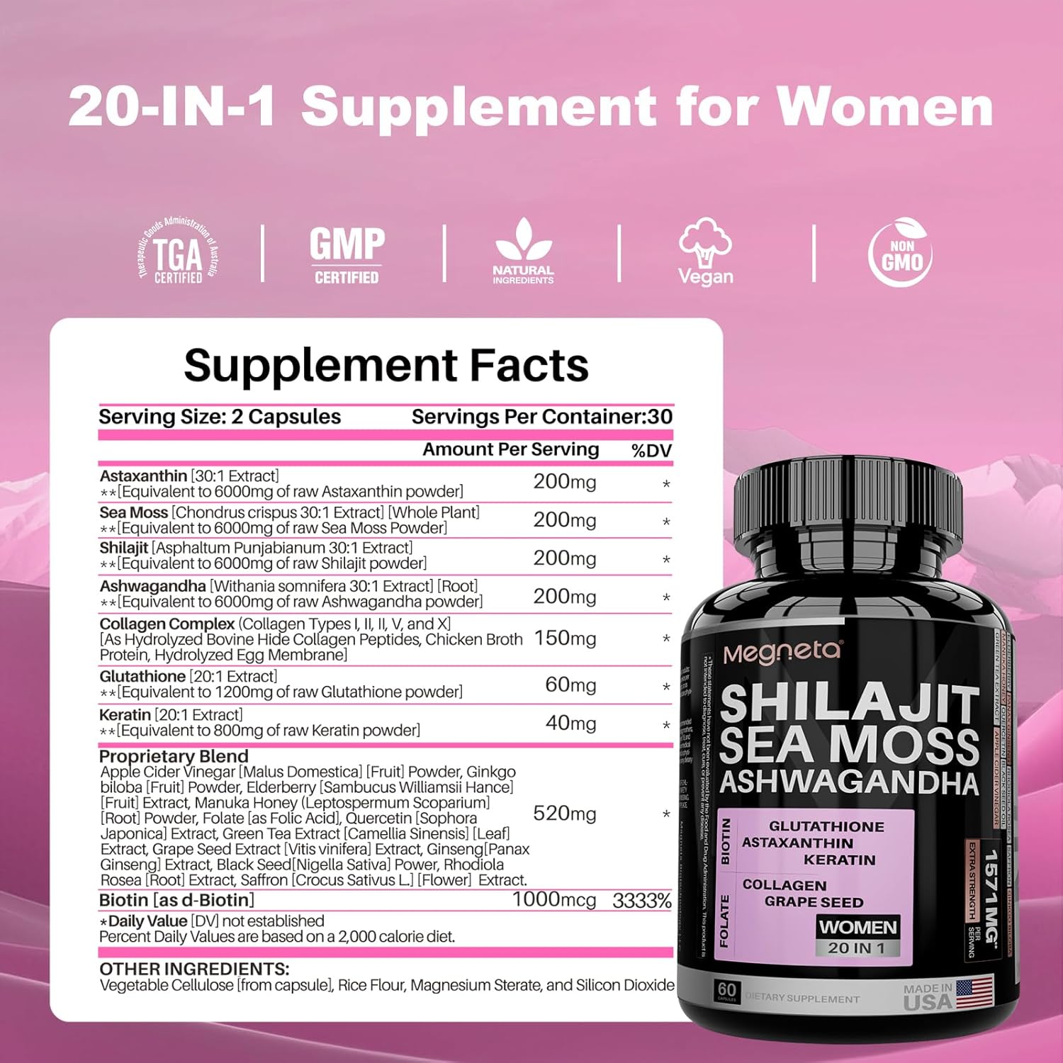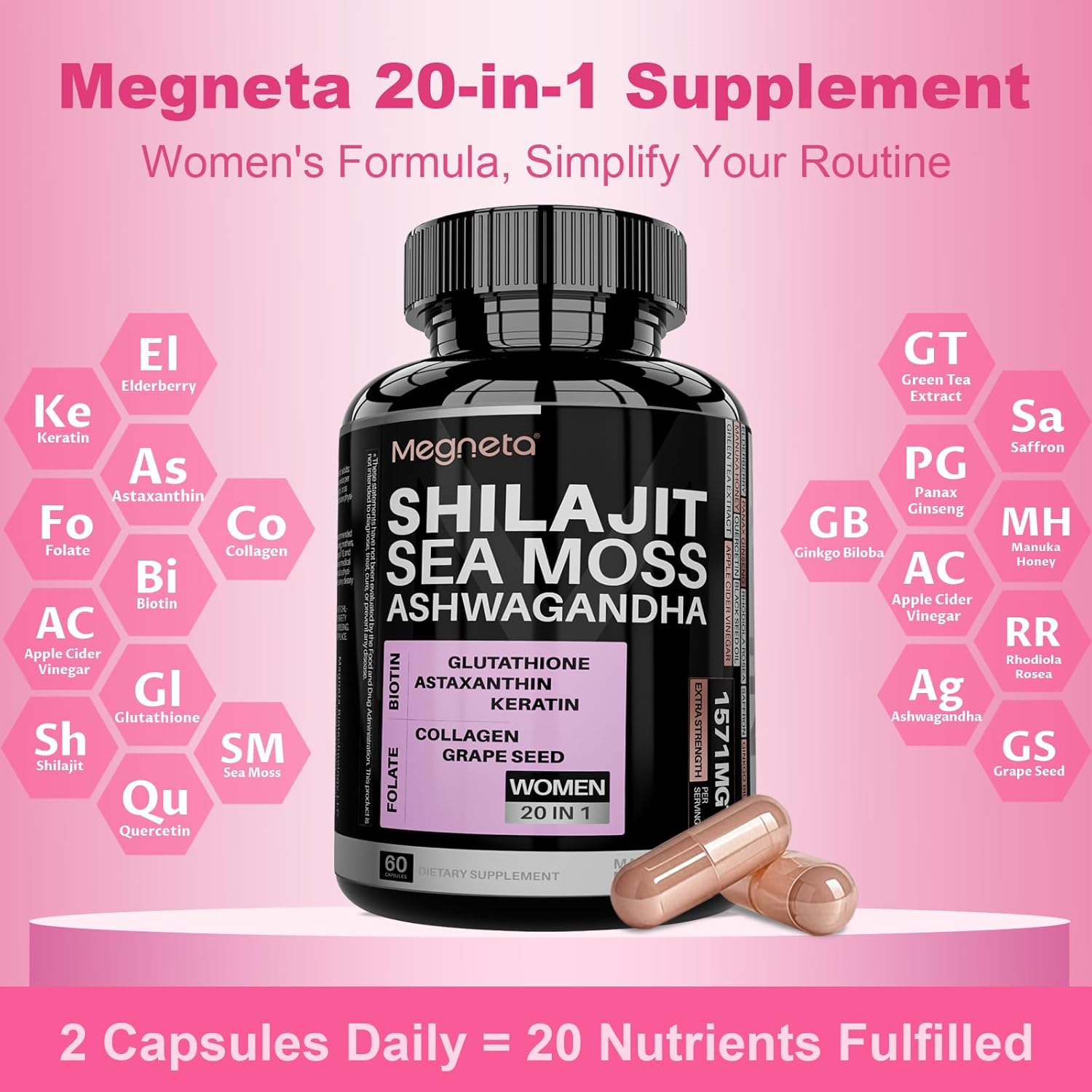 - 20-IN-1 Formula: Megneta sea moss shilajit supplement formula designed for women, combines 20 herbal ingredients into a single capsule to meet your essential needs. Enhance beauty, boost energy, and simplify your supplement routine.