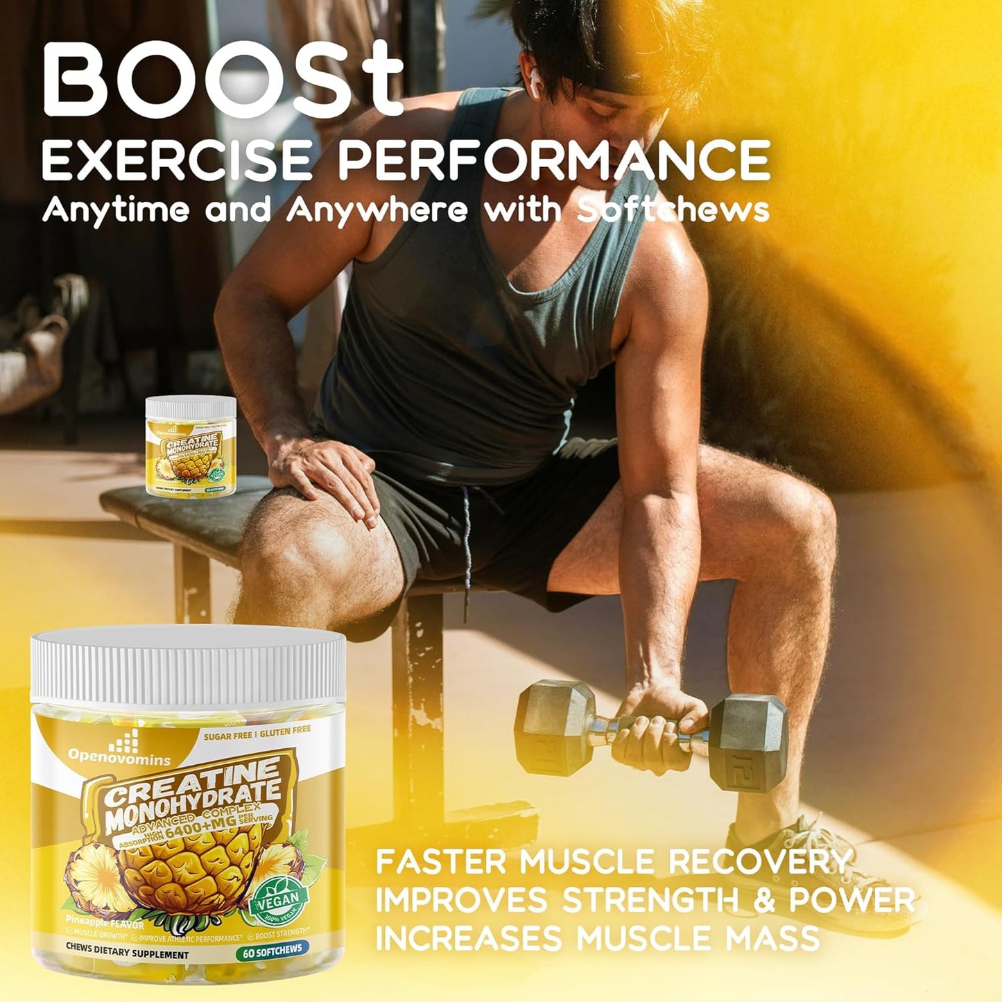Openovomins 6400mg Creatine Monohydrate Soft Chews with L-Taurine & Vitamin B12 - Sugar Free Pineapple Supplement for Men & Women
