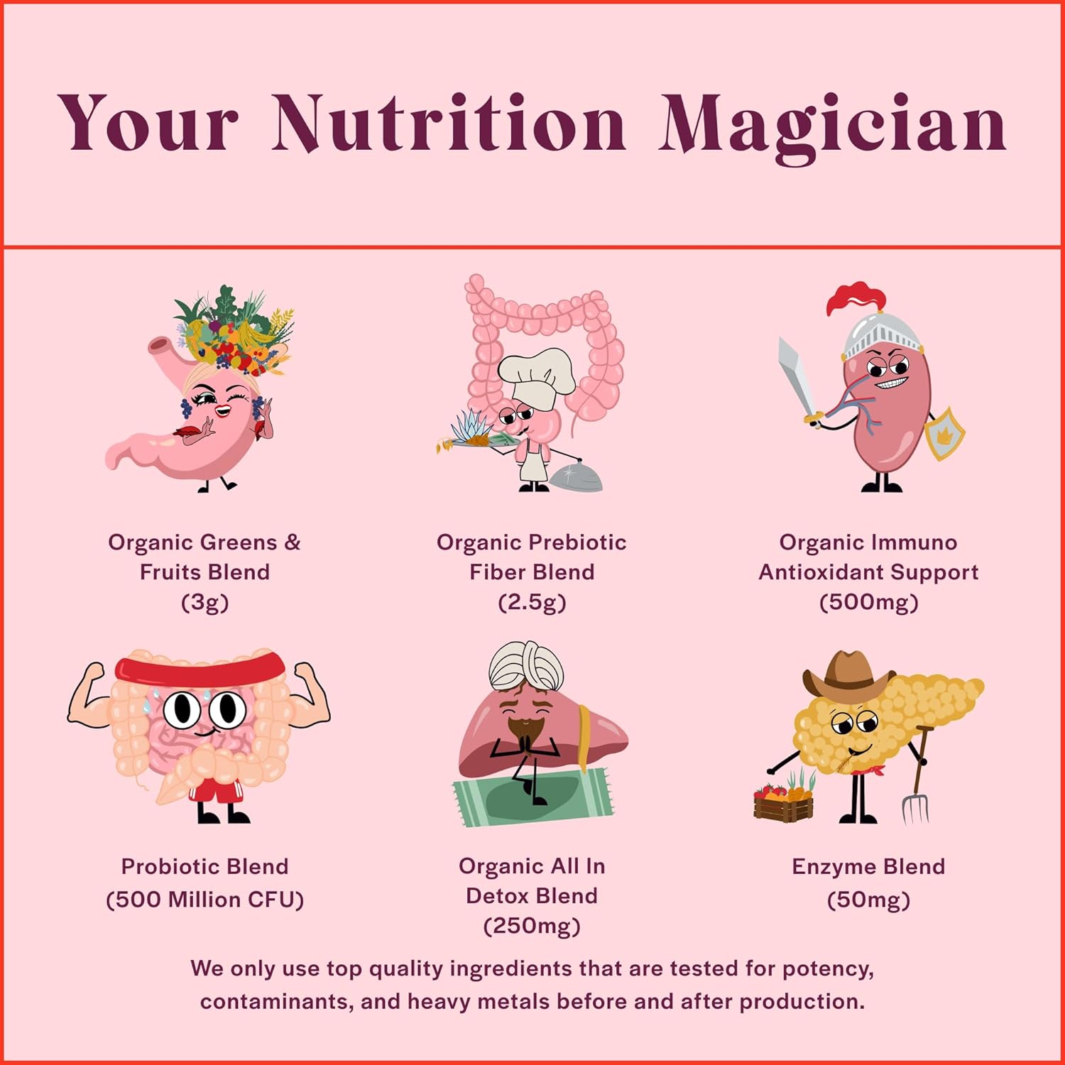 - 35 FRUITS & VEGGIES WITH PREBIOTICS & PROBIOTICS: Organic, research-backed ingredients that keep your gut microbiome in tip top shape and your digestive system healthy (and regular)