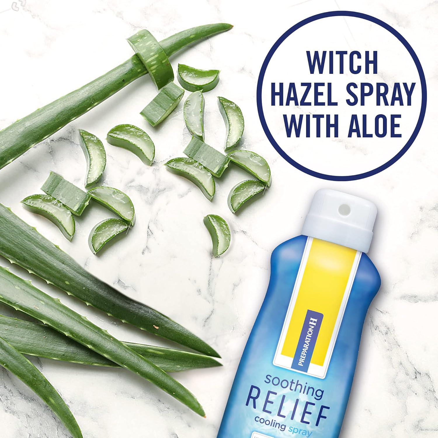 - Two 2.7 ounce bottles of Preparation H Soothing Relief Cooling Spray, Witch Hazel Spray for Irritated Skin Relief