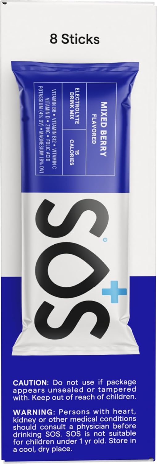 SOS Hydration Electrolyte Powder Packets, Mixed Berry Flavor, 8 Sticks - Low-Cal, Fast Rehydration, USA Made, Keto & Vegan Friendly