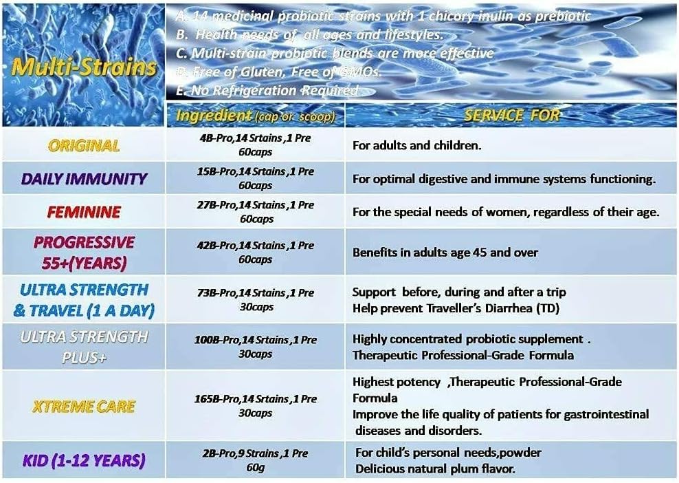 - Provides 100 Billion CFU per capsule;Multi-Strain formulations combine up to 14 probiotic strains with chicory inulin, a prebiotic of superior quality, and are offered in a variety of dosage forms tailored to health needs of all ages and lifestyles.