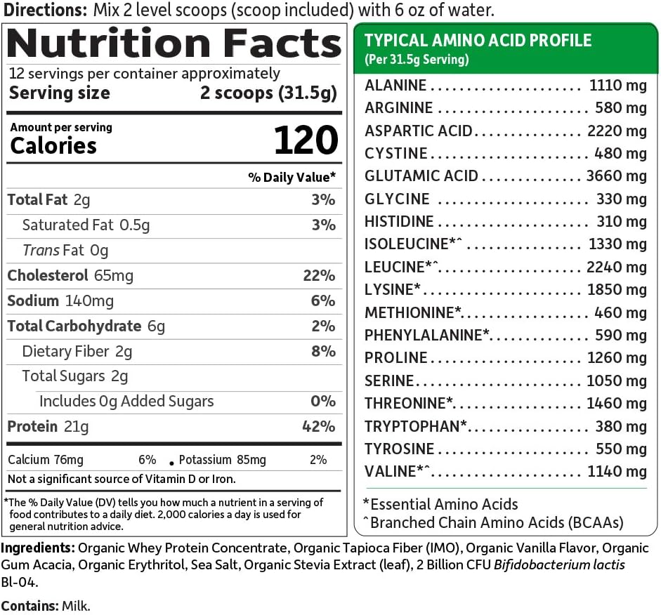 - CERTIFIED ORGANIC HIGH PROTEIN POWDER: In a sea of conventional whey, our Certified Organic Grass Fed Whey Protein is like protein gold, with 21 grams of easy-to-digest, muscle-building protein nutrition in a delicious Vanilla flavor