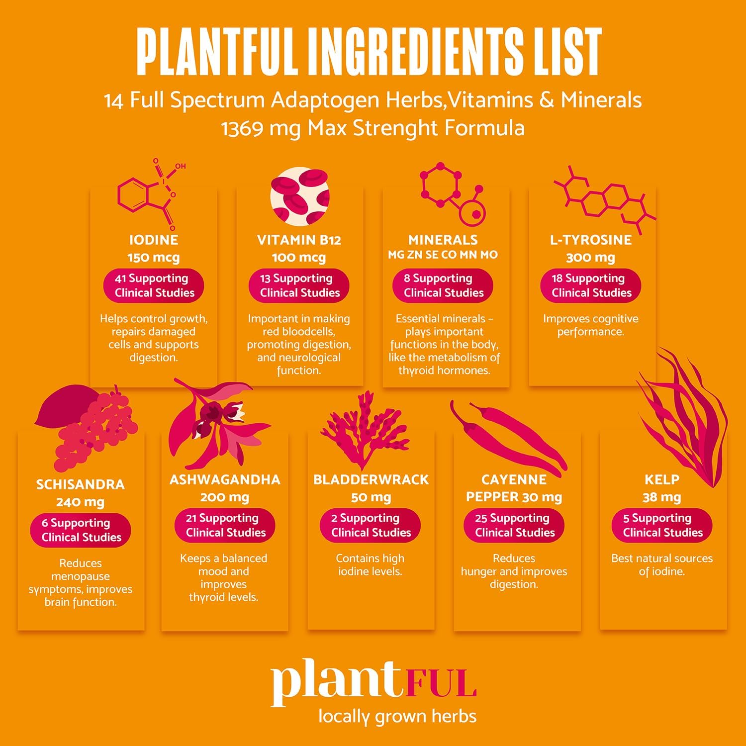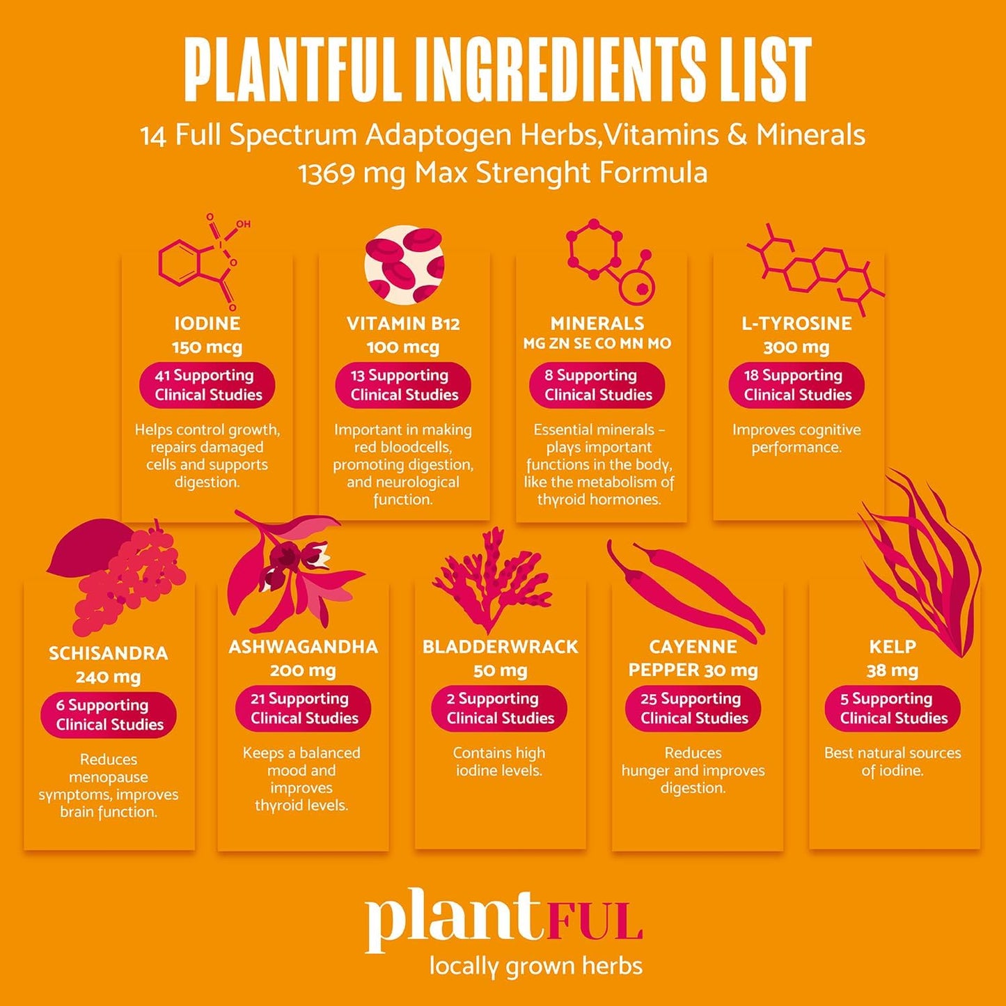 - 14 FULL SPECTRUM ADAPTOGENS HERBS, VITAMINS AND MINERALS. Plantful Iodine Supplement has a max strength formula of thyroid support complex in the correct absorbable amounts of Iodine, Vitamin B12 Complex, minerals, L-Tyrosine, Ashwagandha, Schisandra, Kelp and herbal adaptogens to support thyroid health.